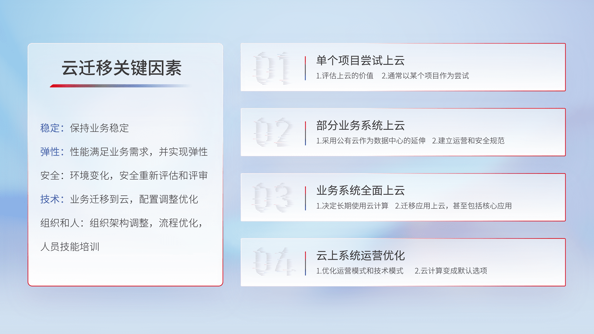 结合实际业务,,,从规划设计、、云平台选型、、、云原生改造、、、数据迁移、、、集成交付,,,,迁移全过程为客户识别最佳上云路径,,做好风险识别管理,,,,设计网络架构、、、身份权限、、、、安全审计合规、、、、操作审计、、、日志审计、、、、监控告警策略、、、、多站点容灾设计等,,,对云上基础设施进行整体规划,,,,提升IT治理水平,,,以满足弹性、、高可用、、高性能的需求。。。