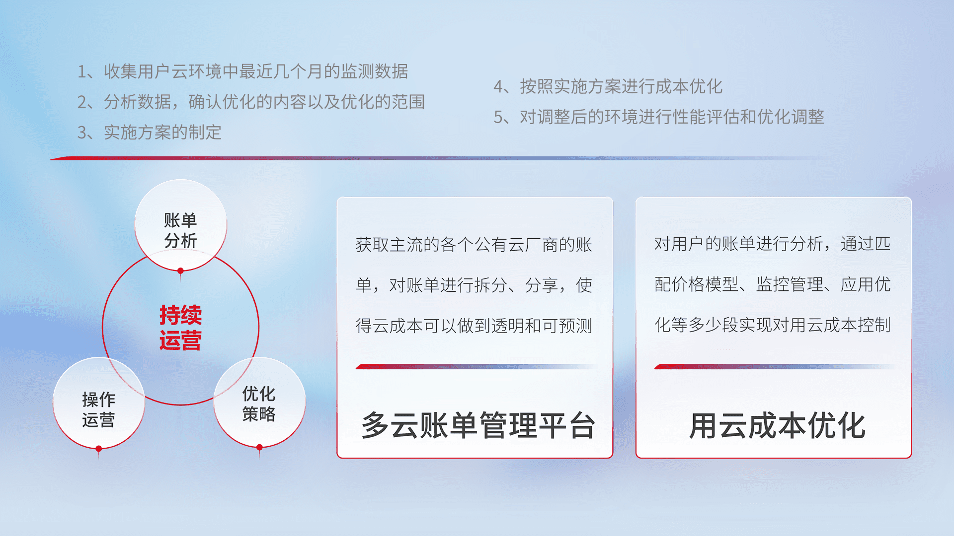 通过多云纳管,,,,以统一的资源数据模型把客户的云资源进行抽象和封装,,,进而实现对多云资源的统一操作,,,保障云资源管理的可靠性、、、、稳定性与可用性。。量身定制化运维内容,,,,配置、、、、开发运维、、补丁管理、、备份、、、、监控、、认证和访问管理、、、、审计和日常巡检等,,保障在用云过程中的可靠度,,,稳定度以及高可用率。。