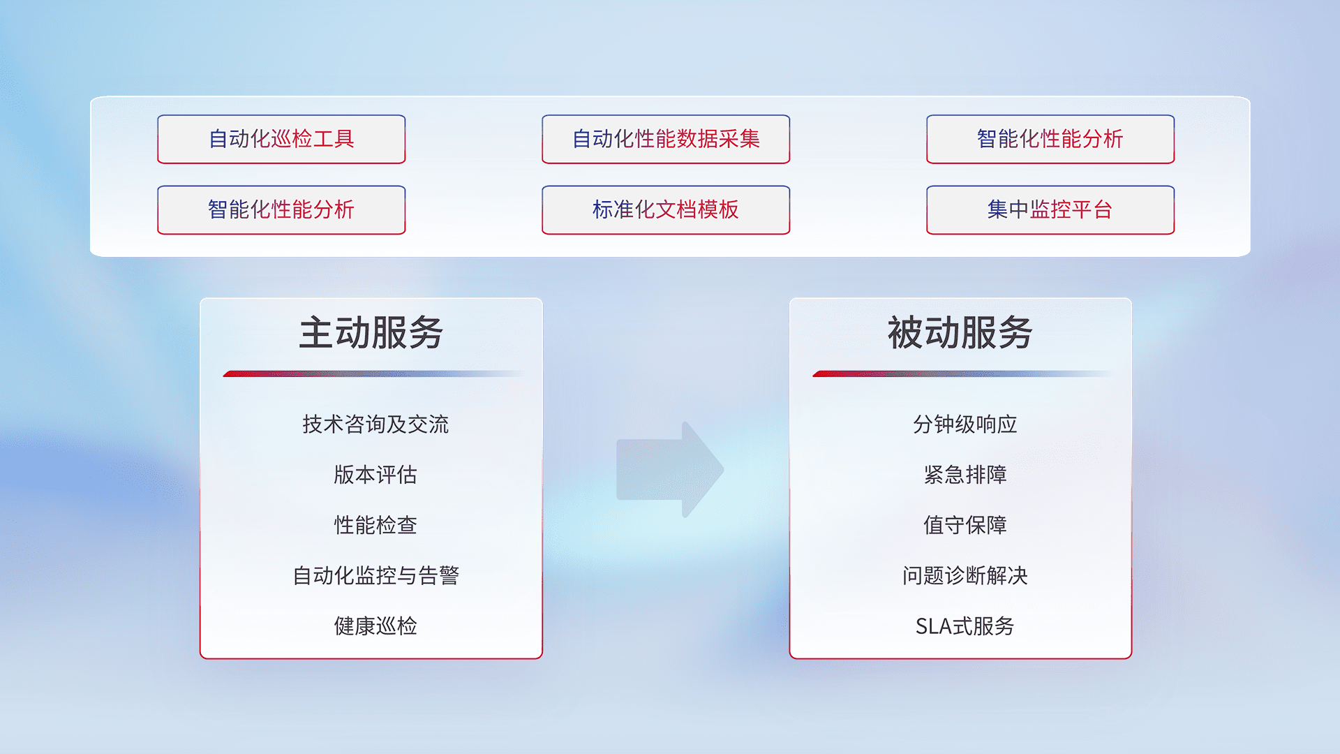 智能化工具和标准化文档,,保障服务质量,,,提供主动服务(包含技术咨询、、、、版本评估、、、、性能检查、、、自动化监控与告警、、、、健康巡检)和被动服务包含(分钟级响应、、紧急排障、、、值守保障、、、、问题诊断解决、、、、SLA服务)。。。。